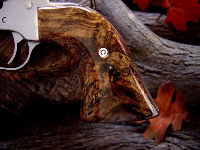 This is a gorgeous set of Presentation Grade grips. They are gold stabilized Spalted Maple with about the best grain and color I have ever seen. They also have beautiful black spalt lines in them. They have a glass smooth Tru Oil finish on them. This set also has flat bottoms with radiused edges